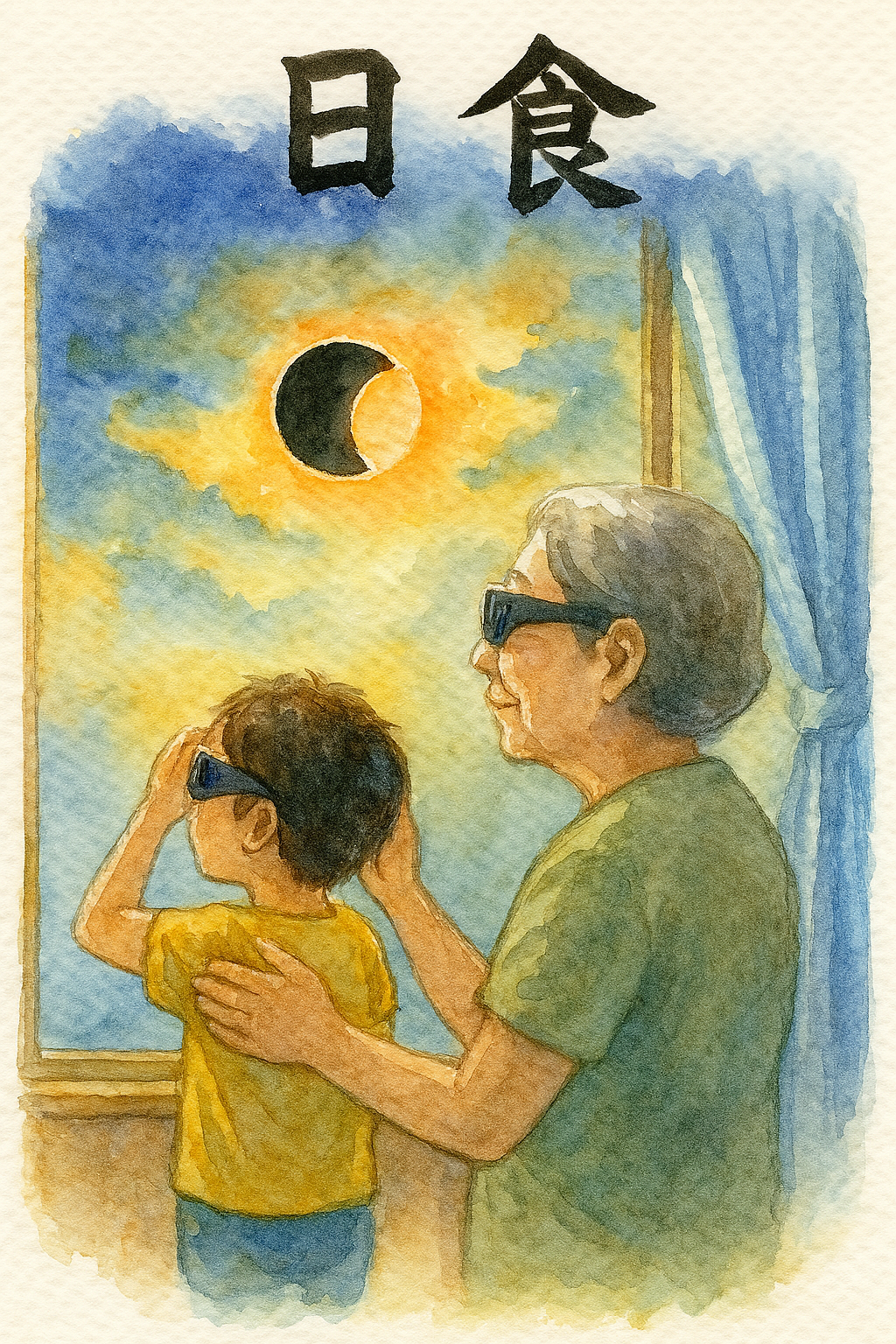 岐阜の里山に差し込む木漏れ日が、日食の影と交差する瞬間。祖母と孫が並んで窓辺に立ち、空を見上げる姿は、まるで時を超えた記憶の一頁のようです。