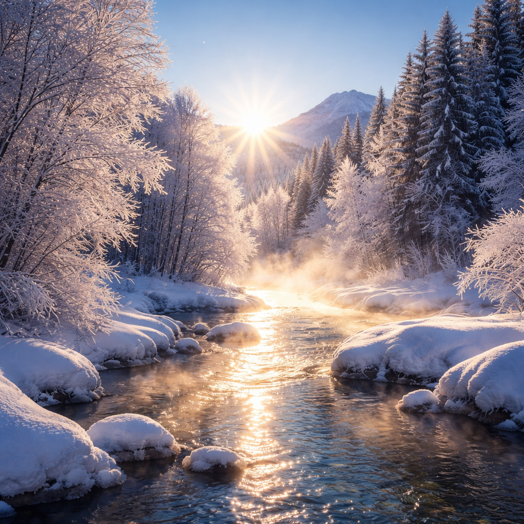 雪に反射する淡い輝き、霜をまとった木々の白さ、川面に揺れる金色のきらめき。