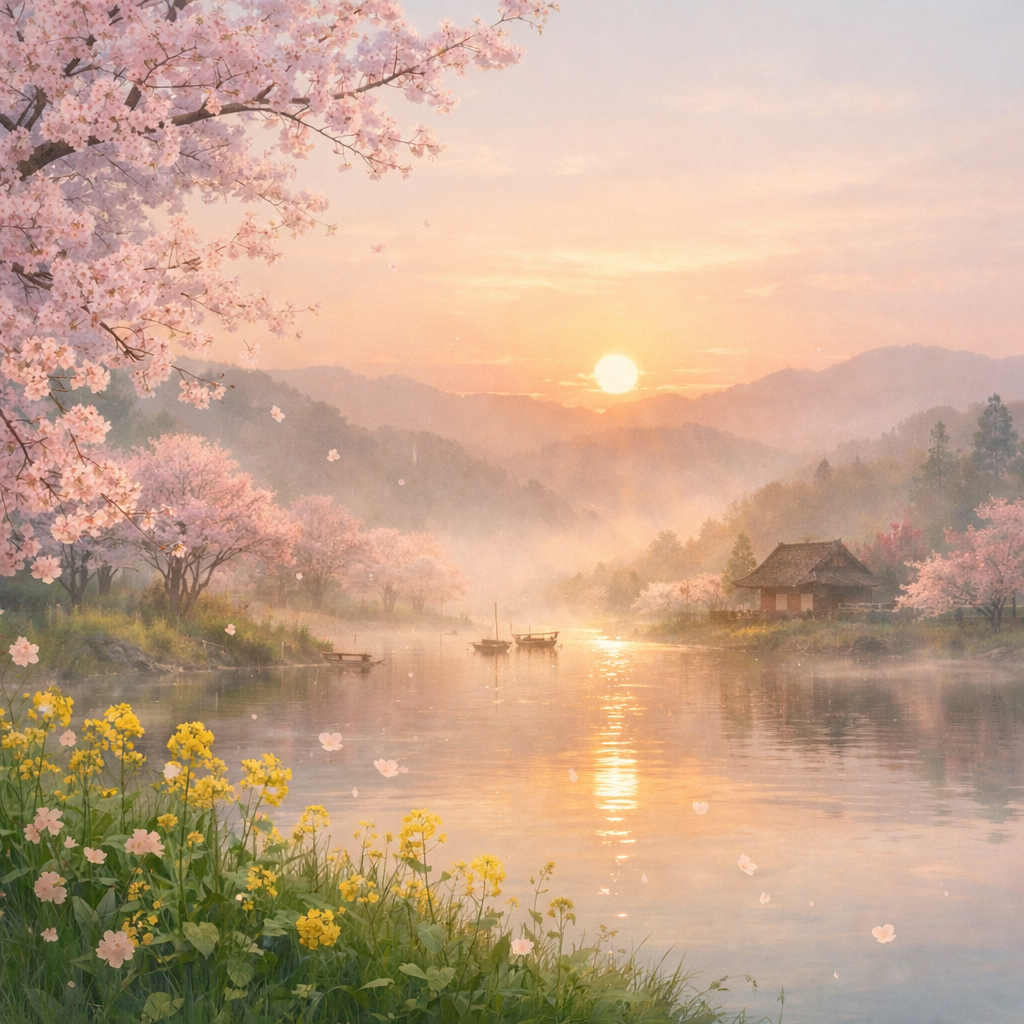 春の霞は、遠くの山並みや川面をやさしくぼかします。