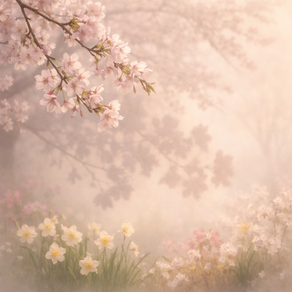 風がそっと吹くたび、花の影が揺れ、霞の空気がゆっくりと流れていく。