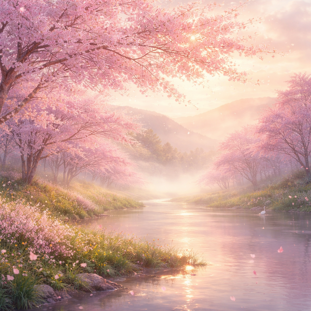 花びらがゆっくりと舞い、光が水面に揺れ、時間がゆるやかに流れていく情景です。