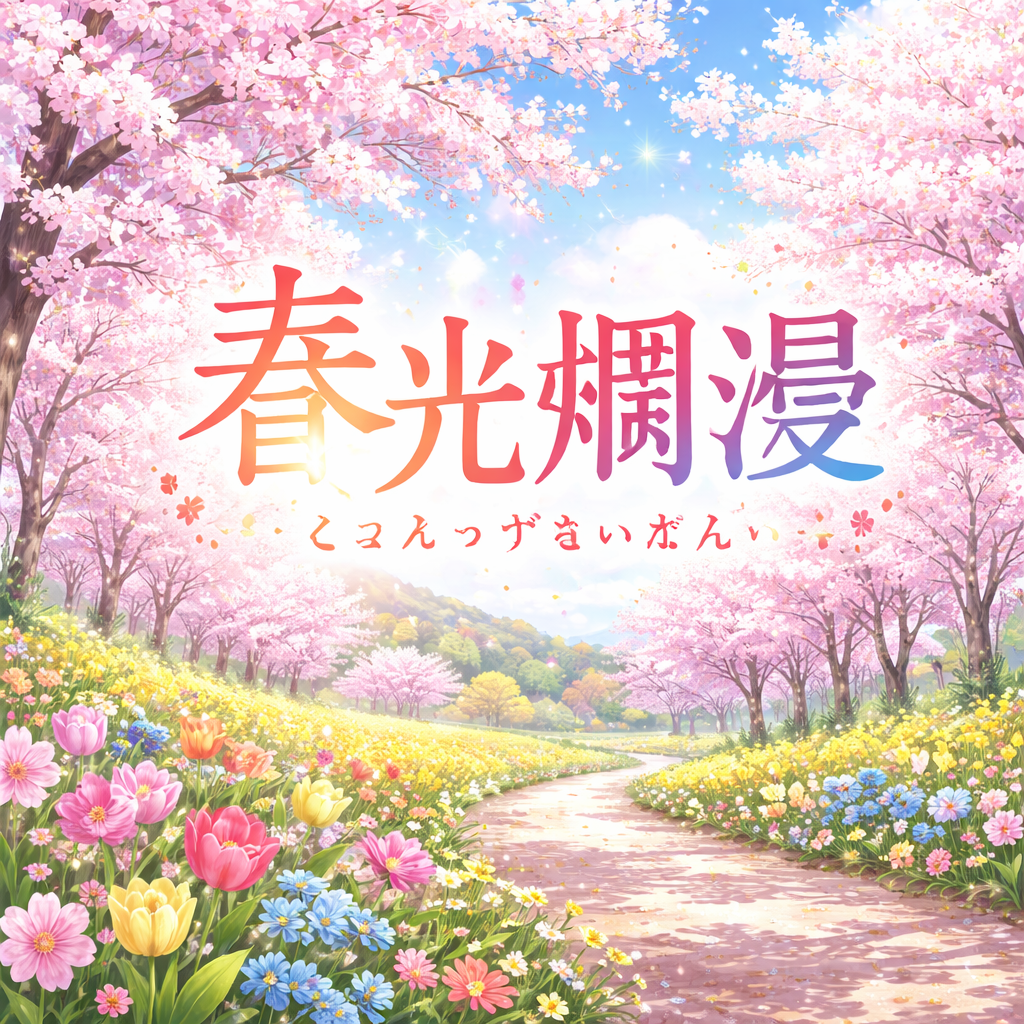 「春光」とは、やわらかく暖かな春の日差しを意味し、「爛漫」は花が咲き乱れ、輝くように広がる様子を表します。二つの言葉が重なることで、ただの春ではなく、最も華やかで美しい「春の頂点」が描かれているのです。